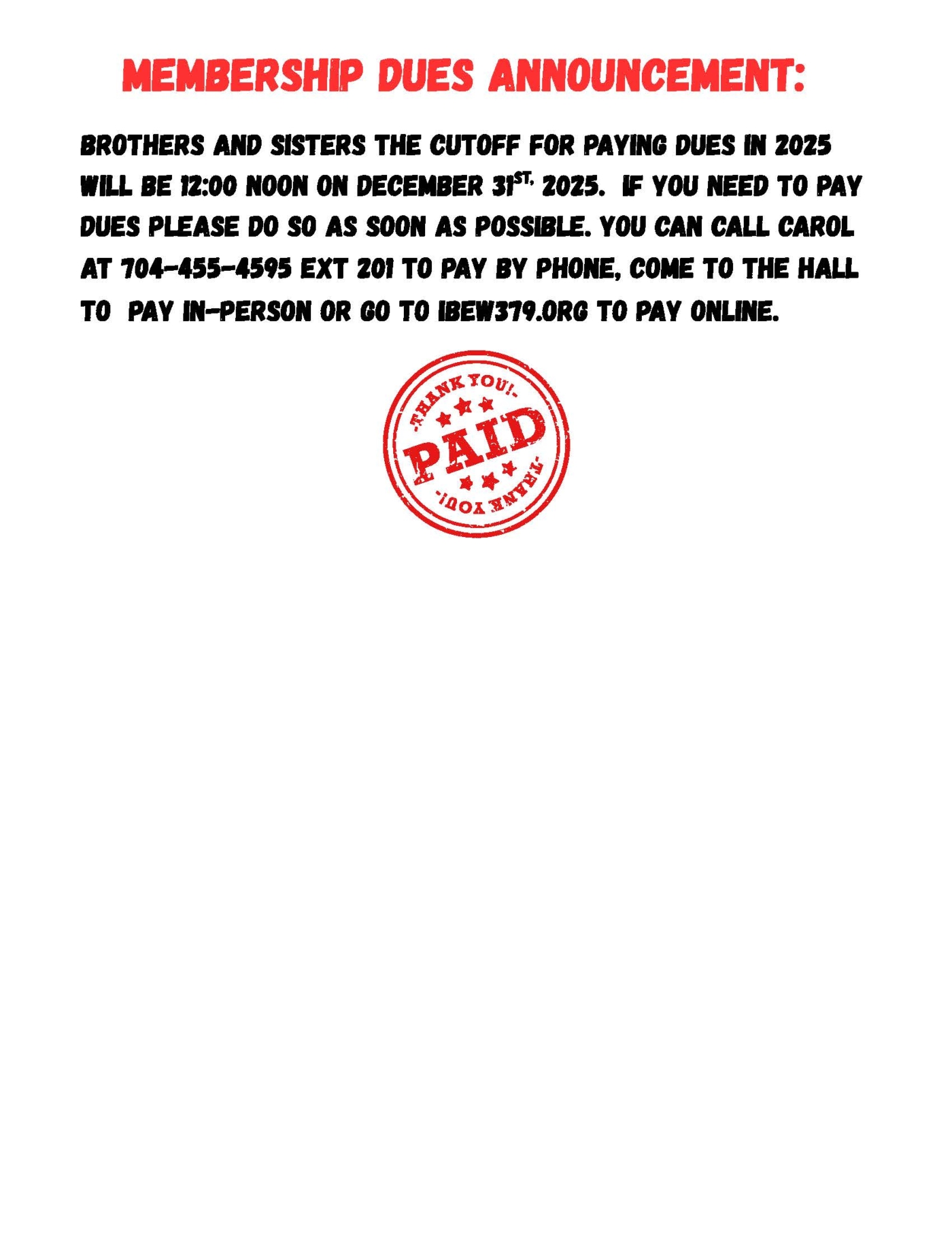 IBEW LU 379 will be closed Wednesday, December 24th, Thursday, December 25th, and Friday, December 26th.  IBEW LU 379 will also be closing on December 31st at 12pm, and be closed on Thursday, January 1st and Friday, January 2nd.